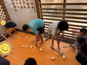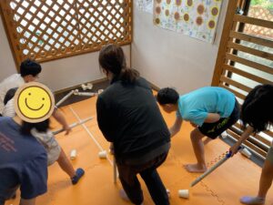 棒を使って、たくさんの紙コップを相手のエリアに入れていきます(^^)