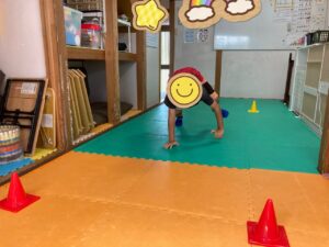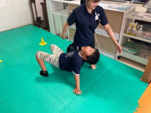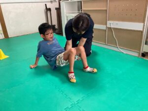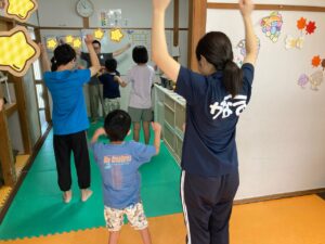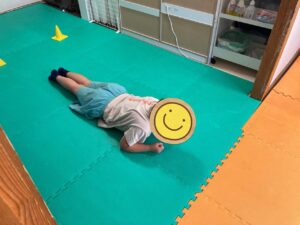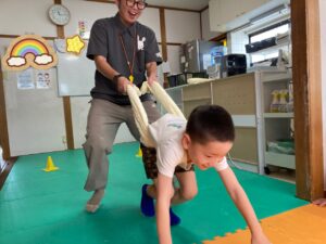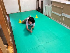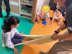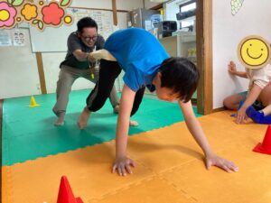 最後はクマ歩きで進む子ども達VSタオルで阻止するスタッフの対決です!