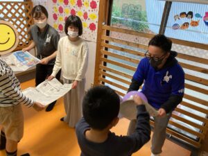 新聞紙を広げるほど、力を入れると破れたりと苦戦していました(^^;;