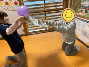お隣のペアに新聞紙を使って、風船を渡していきます(^-^)