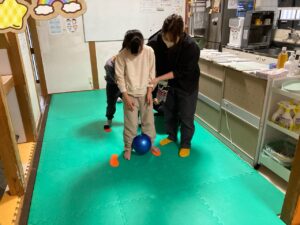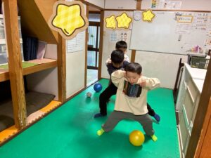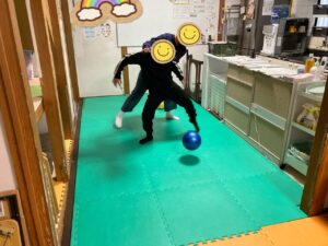 足型に合わせて足を置いて、ボールを足の間から通します(^-^)