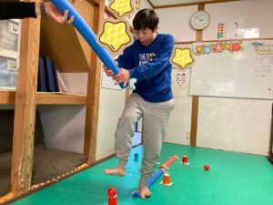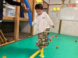 次はプールスティックの上を歩きながら、紙コップの上に乗ったボールを蹴って落としていきます!