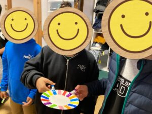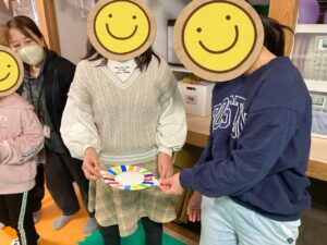 紙皿の洗濯バサミと同じ色の部分を挟んで、隣のお友達に渡していきます(^-^)
