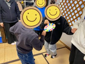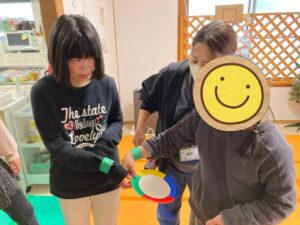 紙皿にも色んな色が塗ってあるので、リストバンドと同じ色の部分を持って、隣のお友達に渡していきます(^^)