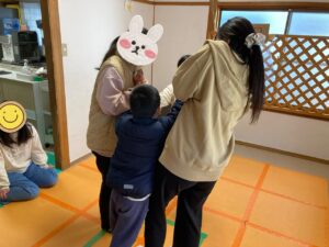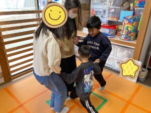 みんなで輪になって手を繋いで、「外!」と言われたら、四角の外にジャンプします(^o^)