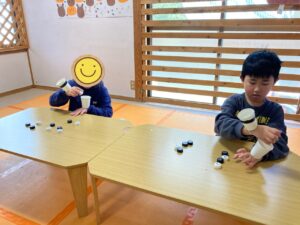 どちらが先に全部のキャップを入れる事が出来るかの勝負です(^o^)