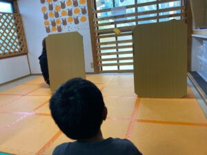 テーブルとテーブルの間から、何かが通るので、何が通ったかな当ててもらいました(^-^)