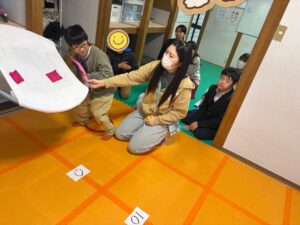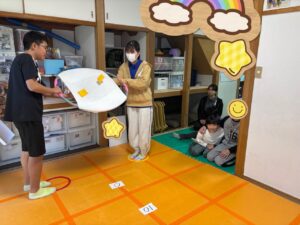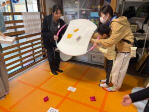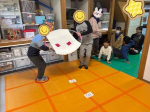 お友達と協力して、後ろからポン!と押すと、お手玉が飛んでいきます(^^)