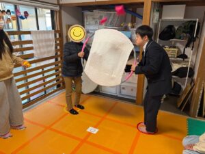 スタッフお手製の、お手玉とばし器を使います(笑)