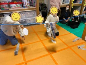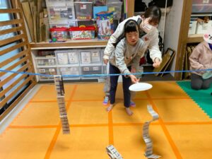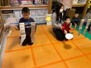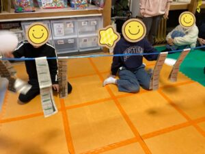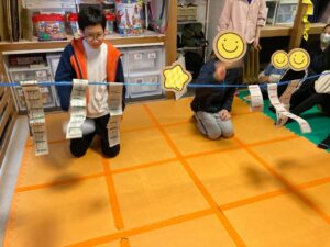 ヒモにぶら下がった新聞を、うちわでパタパタ落としていきます(^-^)