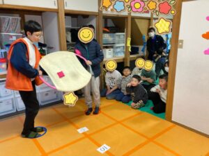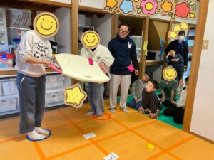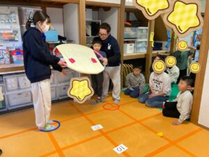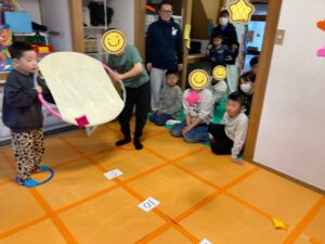 お友達と息を合わせて、お手玉を飛ばします( ´ ▽ ` )