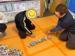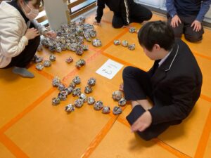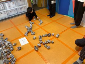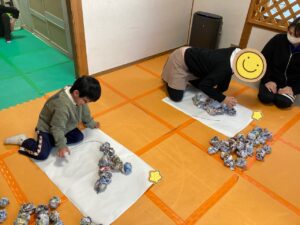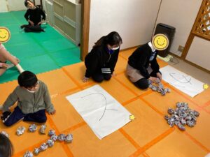 まずは大きな文字の線に沿って、新聞紙ボールを置いていきます(^-^)