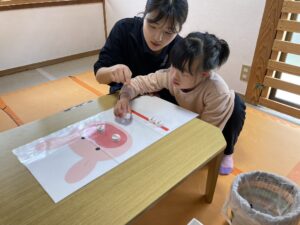 大きな口を開けた動物に、ご飯を口に運んであげます(^-^)