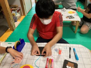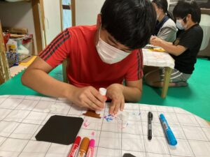 お月様とウサギの顔を描いて、お団子を貼っていきます☆