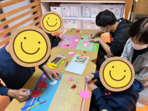 飾りが全部完成したら、ヒモにくっ付けていきます♪